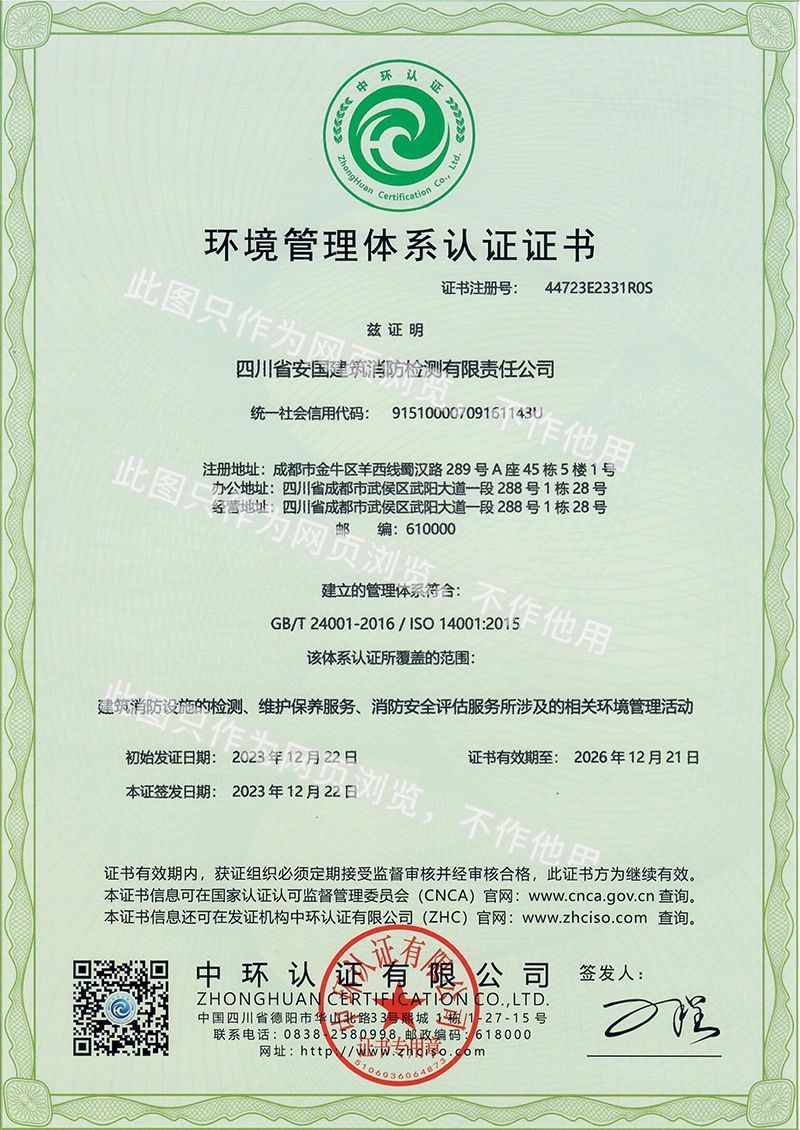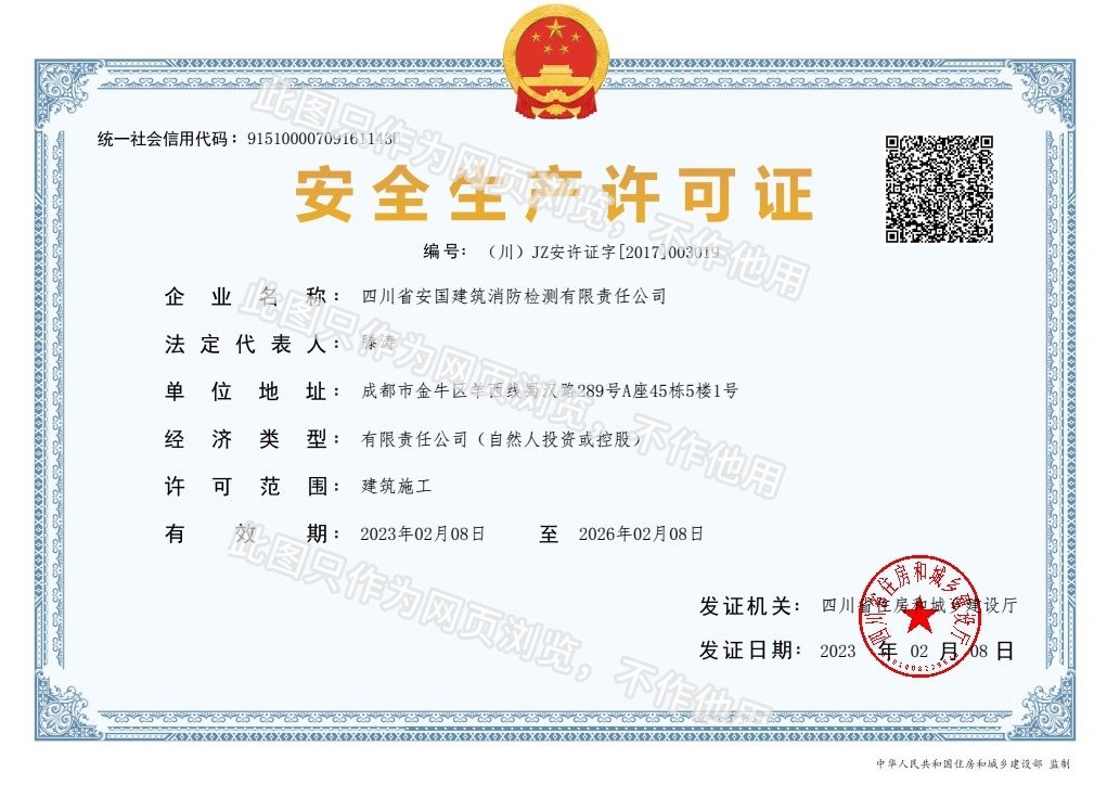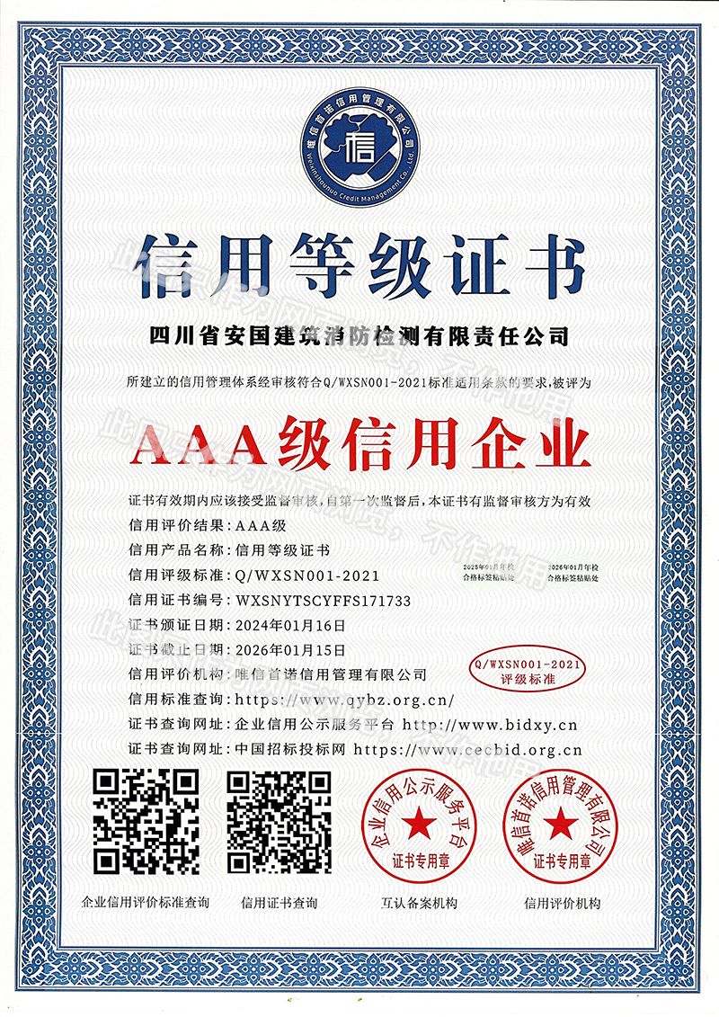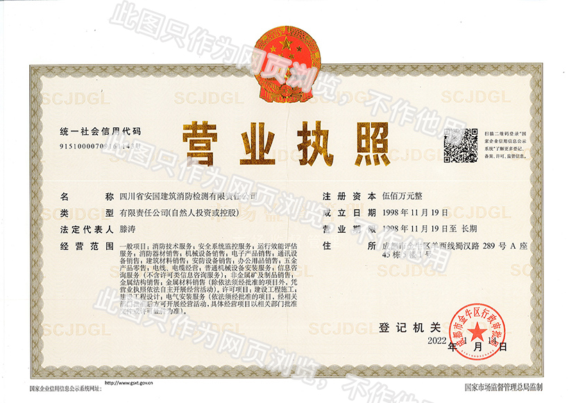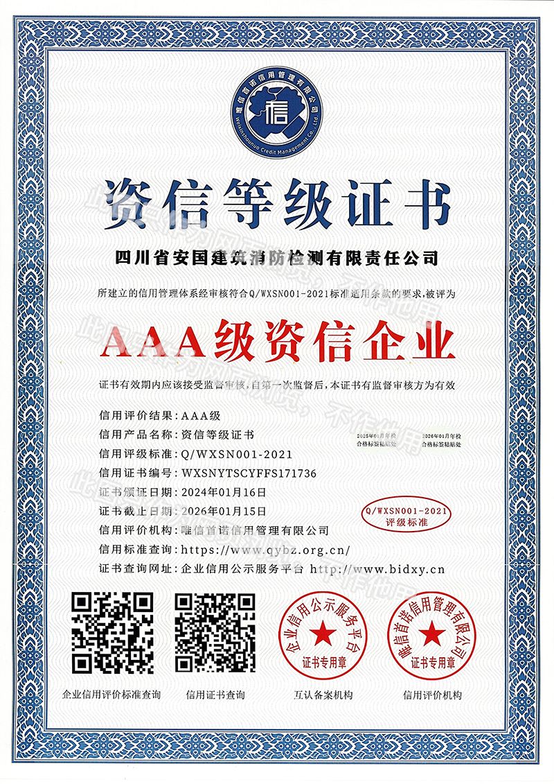 四川省安國建筑消防檢測有限責(zé)任公司,成立于1998年,經(jīng)四川省公安消防總隊批準(zhǔn),工商部門注冊的獨立法人單位。